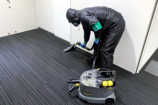 コロナ除染作業を行う際にはウイルスが飛沫します。飛沫したウイルスは落下し床など蓄積します。