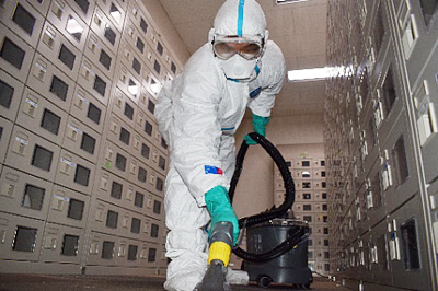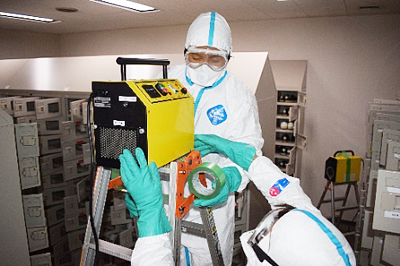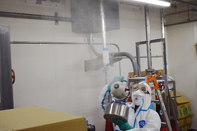 壁等の消毒作業を行います。この作業は全て手作業の人海戦術で行われます。