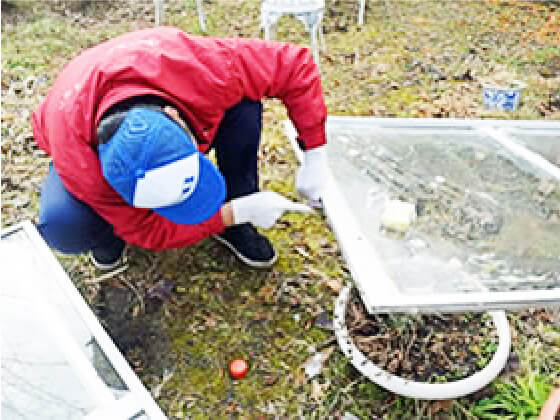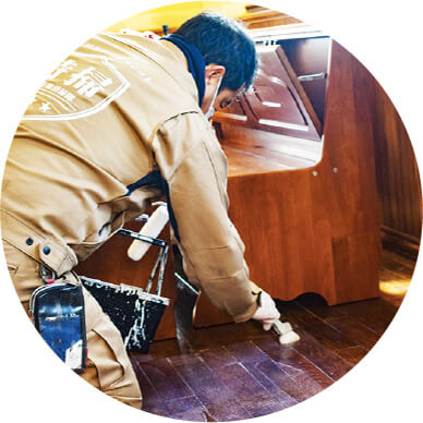 汚染物(糞や尿)を手作業で除去し、丁寧に清掃します。