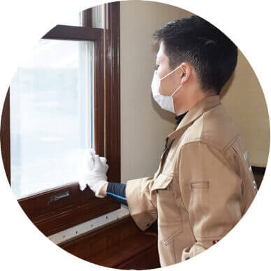 糞の除去の最終工程です。窓枠なども含めて薬剤などを使い細かな所まで洗浄、ふき取りを行います。フローリングの隙間や、敷居のレールなど細かい所まできっちり行う事が完全消臭を可能に致します。
