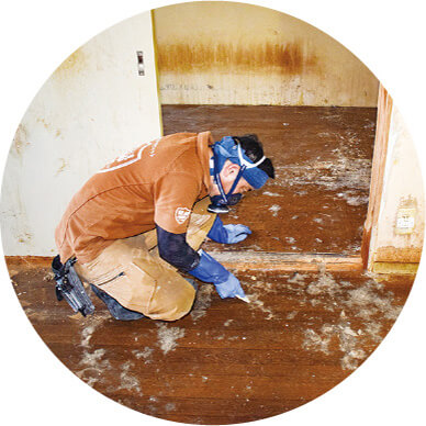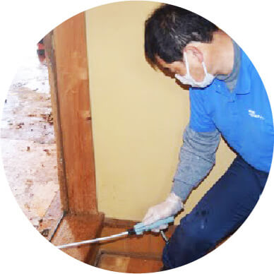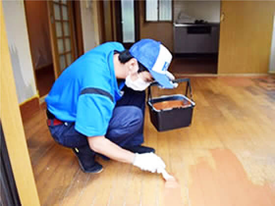 壁材、床材を剥がして染み込んでいる所も徹底的に手作業でクリーニングします。クリーニングしきれない所は特殊コーティングをします。事前にこちらからご相談しますのでご安心下さい。この場合でも追加料金はいただきません。特殊コーティングは自社製の特殊な塗料を塗って臭いを封じ込める作業です。 こうすることにより安価に臭いをふさぎ込めます。