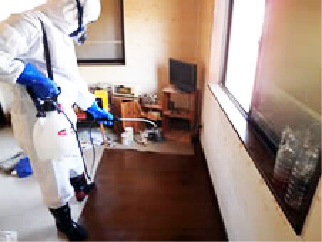 業界最高峰のオゾン発生器を使い、部屋全体をオゾン燻蒸します。オゾンは臭いが発生しますが部屋から漏れて近隣の迷惑にならいように目張りもします。オゾンは換気をしていけば臭いは無くなり、O2(酸素)に分解されて無害になるのでご安心下さい。 またリスクベネフィットでは孤独死現場など多くのハードな経験から確立した、高濃度オゾンを送風機などで部屋全体に循環させながら燻蒸する「ショックトリートメント法®」を用いて徹底した除菌消臭を行います。