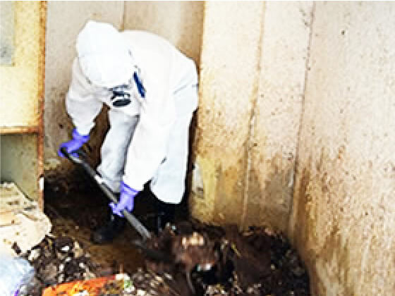 人と動物の共通感染症(レプトスピラ症など)があるために自社製品の消毒剤「RB酸水」を散布します。感染症予防、作業前の初期消毒の為に使用します。RB酸水は市販の消毒剤より高い殺菌効果が有り医療現場でも使用されており動物の血液に含まれている病原体にも非常に有効です。またノロウィルス等も99%殺菌します。専門薬剤で2次被害を防ぎます。