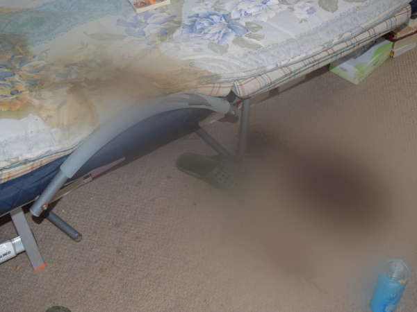 ベッドから足がはみ出していたらしく、カーペットに体液の跡が染み着いていました。