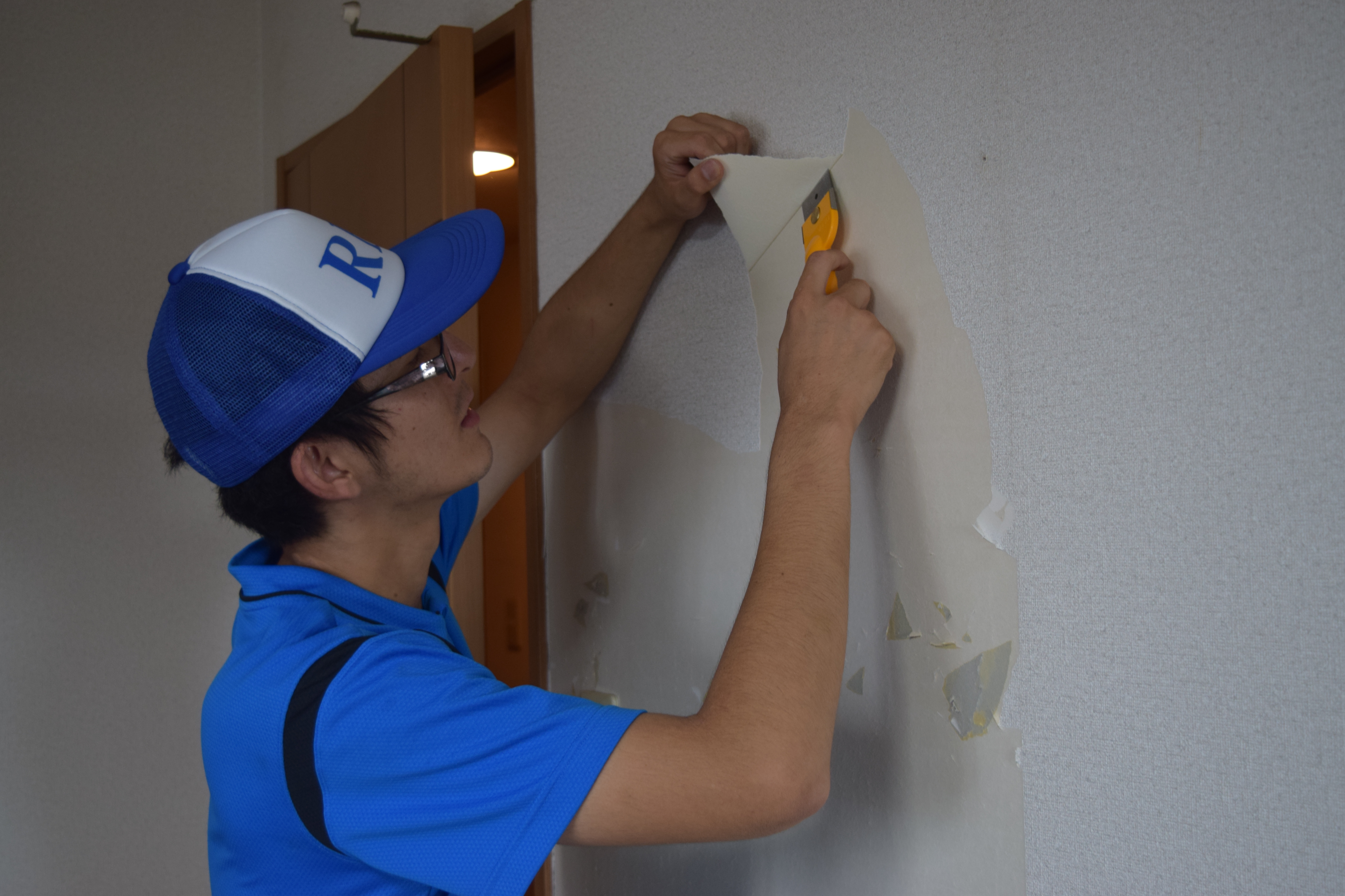 - 臭いの染みついてしまった壁紙クロスを剥がします。