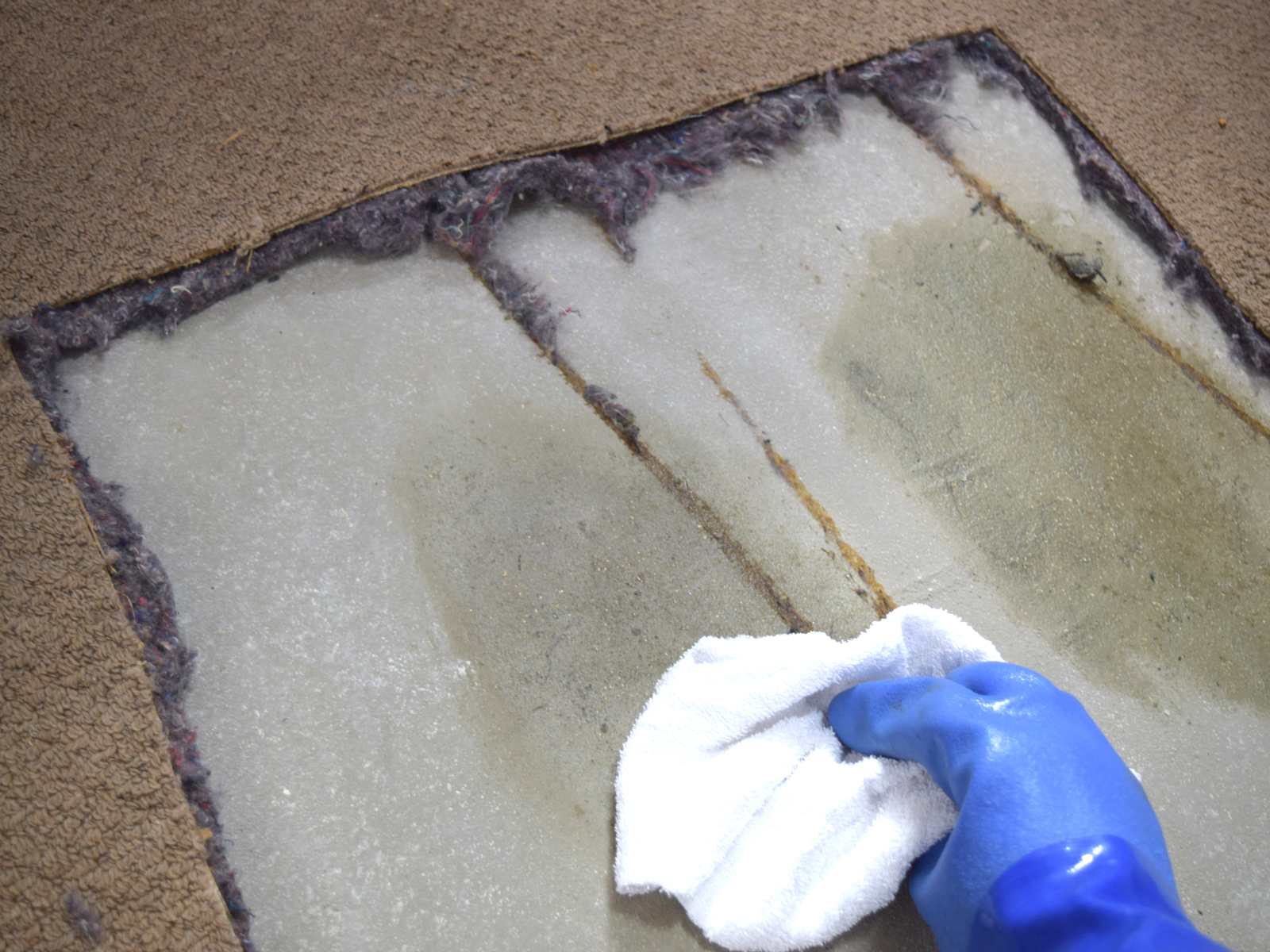 - 汚染物の染みついたカーペットを一部分のみ切り取り、タロウで洗浄・拭き上げを数回行います。その後特殊コーティングを施します。