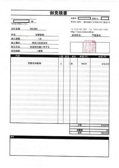 秋田市でイタチの死骸が!拡散した異臭を消し去る具体的な方法とは? 初期消毒後、コンテナ内の荷物を出します。 イタチの亡骸を搬出します。 消毒後の消臭準備中です。 中の汚染された荷物をペール袋に入れ処分します。 段ボール一箱分の資材が汚染されていました。 コンテナにイタチの死骸が!拡散した異臭を消し去るにはどうすればいい? 私が会社のガレージの異臭に気づいたのは、つい数週間前のこと。 同僚から「ガレージ付近を通ると変な臭いがしないか?」と声をかけられたことがきっかけでした。 他の同僚や後輩などにも聞いてみると、やはりみんな臭いが気になっているとのこと。 「何かあるのかな?ちょっと確かめてみよう」と数名の同僚に声をかけ、みんなでガレージ付近に行ってみることに。 近くに到着すると、やはり異臭が漂っています。 あたりを注意深く観察してみると、どうやらガレージにあるコンテナ付近から異臭がしているようです。 コンテナに近づくにつれ臭いが強くなっていくのがわかりました。 恐る恐るコンテナの中を見ると、なんと動物の死骸が! しかも死骸は腐乱が進んでおり、強烈な異臭の原因となっているようでした。 私たちはとても驚いてしまったのですが、このまま放っておく訳にはいきません。 とにかく動物の死体処理や清掃をしてくれる業者がないか調べることに。 そんな中、ホームページに「24時間受付可能」と記載されたリスクベネフィットさんを発見しました。 どうやらこれまでさまざまな現場で特殊清掃を行ってきたプロの業者さんのようです。 早速電話をして「なるべく早く来て欲しい」と頼んでみると、「すぐ対応いたします!お任せください」という頼もしいお返事が。 その対応に信頼できると感じ、そのままお願いすることにしました。 害獣の死臭を消し去る具体的な方法とは? 依頼してからしばらくすると、すぐに清掃員の方が2人来てくれました。 コンテナの中では、どうやらイタチが死んでいたようです。 やはり死んでからしばらく経っていたらしく、腐敗もかなり進んでいるとのこと。 私たちは少し混乱してしまったのですが、スタッフさんは慣れた手つきで下記の作業を進めてくださいました。 ①消毒と死骸の搬出 初めに、消毒剤「RB酸水」を噴霧し、初期消毒を行ってもらいます。 その後、コンテナ内の荷物を慎重に外に運び出し、イタチの亡骸を取り出してもらいました。 動物の死骸処理に関しては自治体ごとに決まりがあるらしいので、そのルールにも従った上で処分してもらうことに。 私たちだけでは処理の仕方まで気が回らなかったので、やはりプロの業者にお願いして正解だったと感じました。 ②洗浄や消毒、消臭作業 死骸を撤去したあとは、体液で汚染された箇所をしっかりと洗浄してもらいます。 コンテナ内にあった資材はイタチの体液に汚染されていたらしく、処分してもらうことになりました。 ペール袋に入れて密封したものを、段ボールの中に入れ消毒を施した上で搬出してもらいます。 その後は害獣専用洗浄剤を散布し臭いのもとを取り除いた上で、オゾン脱臭機を用いて完全消臭してもらいました。 すべての作業が完了したと言われコンテナ付近の様子を確認すると、あの嫌な臭いはすっかりなくなっていました。 従業員一同ほっと胸を撫で下ろし、これでまた落ち着いて業務にあたれそうです。 一時はどうなることかと思いましたが、リスクベネフィットさんがすぐに対応してくださったおかげで本当に助かりました。 この度は誠にありがとうございました。 作業: 害獣死体除去 人数: 2人 日数: 1日 参考費用: 84,964(税込)円(税込) 実際の見積書を確認する
