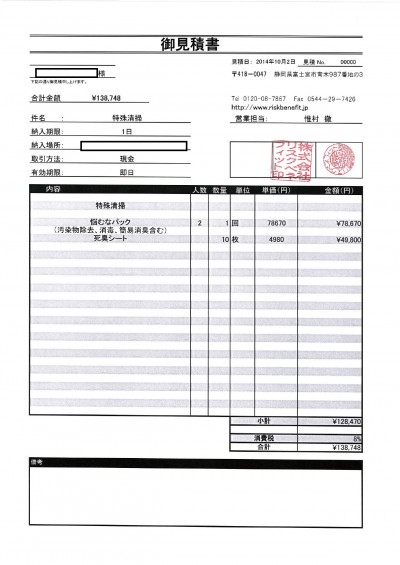 - 作業: 特殊清掃(悩むなパック+死臭シート)