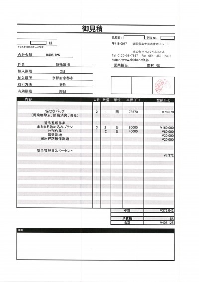 「あくまでも見積もりは目安であり、見積もり以上の金額を請求されることはない」という説明があったため、そのままリスクベネフィットさんにお願いすることにしました。