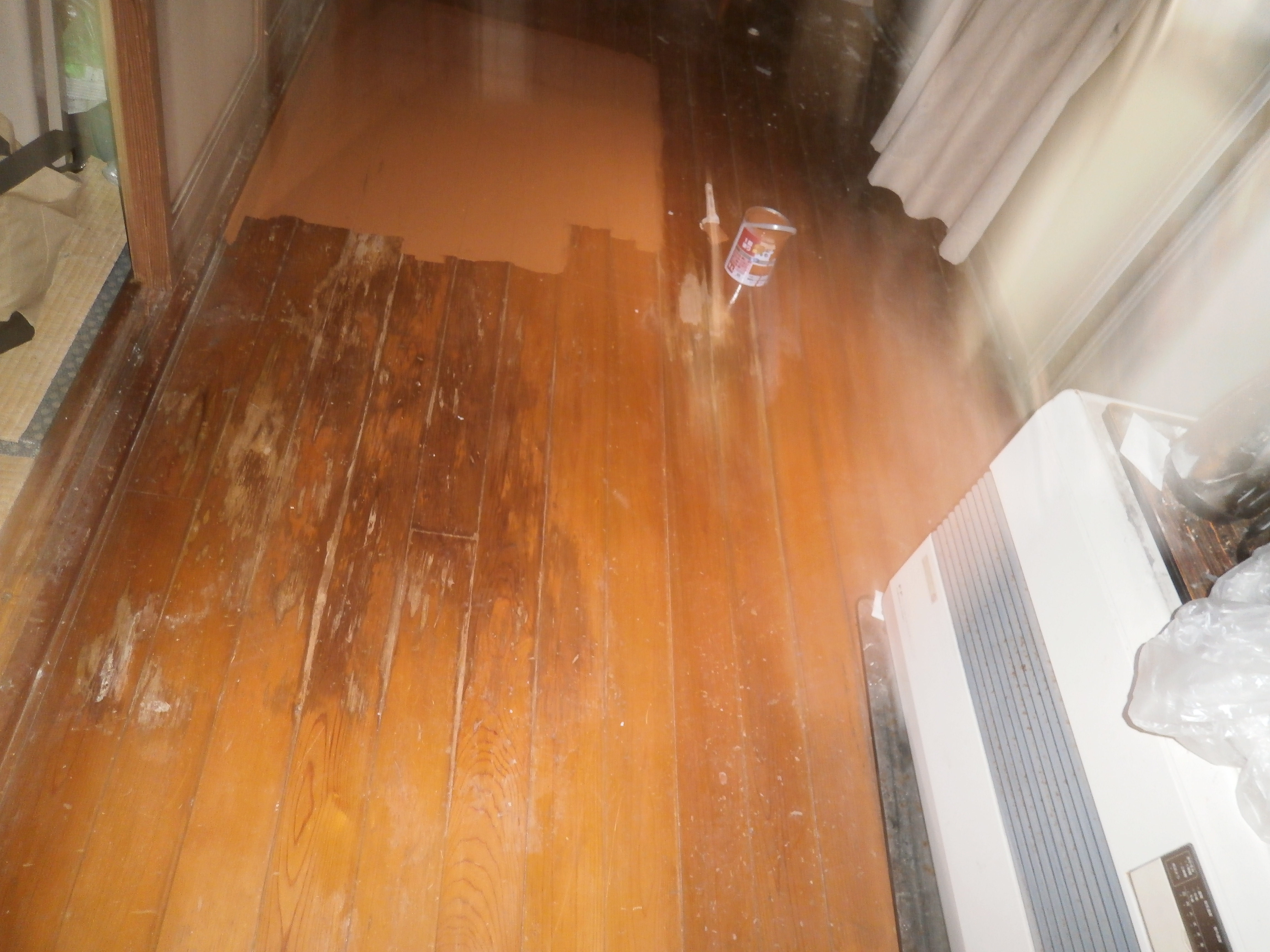 廊下の血液は除去後、オリジナル薬剤で何度も拭き上げていました。