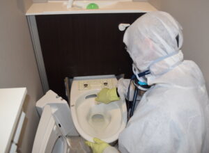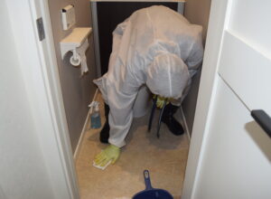トイレには遺体の痕跡が残ってしまい、そのままでは使えない状態です。さらに、トイレや浴室周辺には独特な臭いも漂っていました。