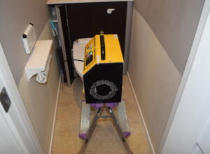 脚立の上に乗った黄色い機械。これが、清掃だけでは取れない臭いを除去してくれる優れもの。