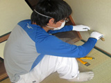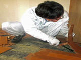 部屋は一目見ると綺麗な状態のように見えましたが、担当の方はすぐに床を剥がして中の様子をチェックしていました。