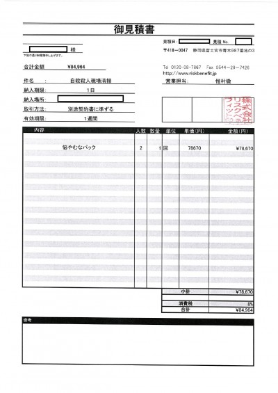仙台市の殺人現場清掃。血液に潜む感染症のリスクとは? 血だまりが出来ています。 アップにしてみると… ふき取ると伸びてしまって、意外に大変なんです。 隅などの細かい所もチェックします。 当たりは真夜中です。物音立てずに、防護服で突入です。 家の中で母が殺された。どうしたらいいのか…。 私は、実家暮らしのただの会社員です。 しかし、平和な暮らしが一変する事件が起きてしまいました。 母が金品目当てに家に入った強盗に刺され、そのまま亡くなってしまったのです。 その日は飲み会があり、私の帰りが遅くなってしまった日でした。 家に帰り、部屋の明かりをつけると自分の家とは思えないほどの散らかりよう。 すると、血を流し横たわっている母の姿が目に入り、びっくりしてしまいました。 焦りながらも救急車と警察に電話をし、単身赴任中の父にも連絡。 救急隊員が来た時には、「もう助からない」と言われ、泣き崩れてしまいました…。 すべての手続きや対応が終わって、家に帰ると臭気がキツくて家に入れませんでした。 すぐにインターネットで清掃業者を探して、リスクベネフィット様を見つけました。 その決め手は24時間対応していること、特殊清掃の実績が豊富であるという点です。 リスクベネフィット様にすぐに連絡して来ていただくようにお願いしました。 血液には感染症のリスクも!? リスクベネフィット様に教えていただいたのですが、血液にはかなり感染症のリスクがあるようです。 B型肝炎ウイルス、C型肝炎ウイルスや人免疫不全ウイルスのような血液媒体ウイルスに感染する恐れがあります。 母は至って健康であったため、大丈夫だと思っていました。 しかし、ウイルス感染の潜伏期間である可能性もあり、健康体であっても血液は危険だそうです。 今回の私のような現場に立ち会ったときは、容易に血に触れないように気をつけてください。 リスクベネフィット様の対応 私が電話をしたときは、すでに夜中の0時を過ぎていました。 リスクベネフィット様は幾度も電話の対応しているためか、落ち着いた様子で受け応えされていたのを覚えています。 緊急要請をお願いしたので、スケジュールをすぐに調整してきていただきました。 リスクベネフィット様が到着したのは真夜中2時頃。 部屋の状態を見ていただいた後、すぐに特殊清掃に入っていただきました。 特殊清掃業務開始 スタッフさんは防護服などで完全防衛した状態でRB酸水とオゾンでの消毒作業を開始されました。 消毒作業は感染症などの2次被害を防ぐために行うようです。 血液や、体液は脂成分を含んでいるので大変滑りやすく危険なのだとか。 そのため、慎重に作業を進められていました。 消毒完了後、次に行っていたのが室内の血液のふき取りです。 殺人や自殺現場などは色々な箇所に血が飛んでおりますので、見落とさないように見渡し拭き上げていただきました。 見落としてしまうと2次被害が起きるので、絶対に許されないそうです。 血液を取り除き、リスクベネフィット様オリジナルの消毒剤【RB散水】を全体に散布してくださいます。 さらに高濃度オゾン発生機の【パンサー】を設置して稼働させ、室内全体をオゾンの力で高い除菌、消臭効果を施してくださいました。 清掃完了後、作業内容の報告に来ていただき終了となりました。 リスクベネフィット様は24時間営業しており、すぐに清掃にきていただけたのでとても助かりました。 私の気持ちに寄り添った対応をしてくださり、リスクベネフィット様に頼んで本当に良かったと思います。 この度は大変お世話になり、ありがとうございました! 作業: 殺人現場清掃 人数: 2人 日数: 1日 参考費用: 84,964(税込)円(税込) 実際の見積書を確認する