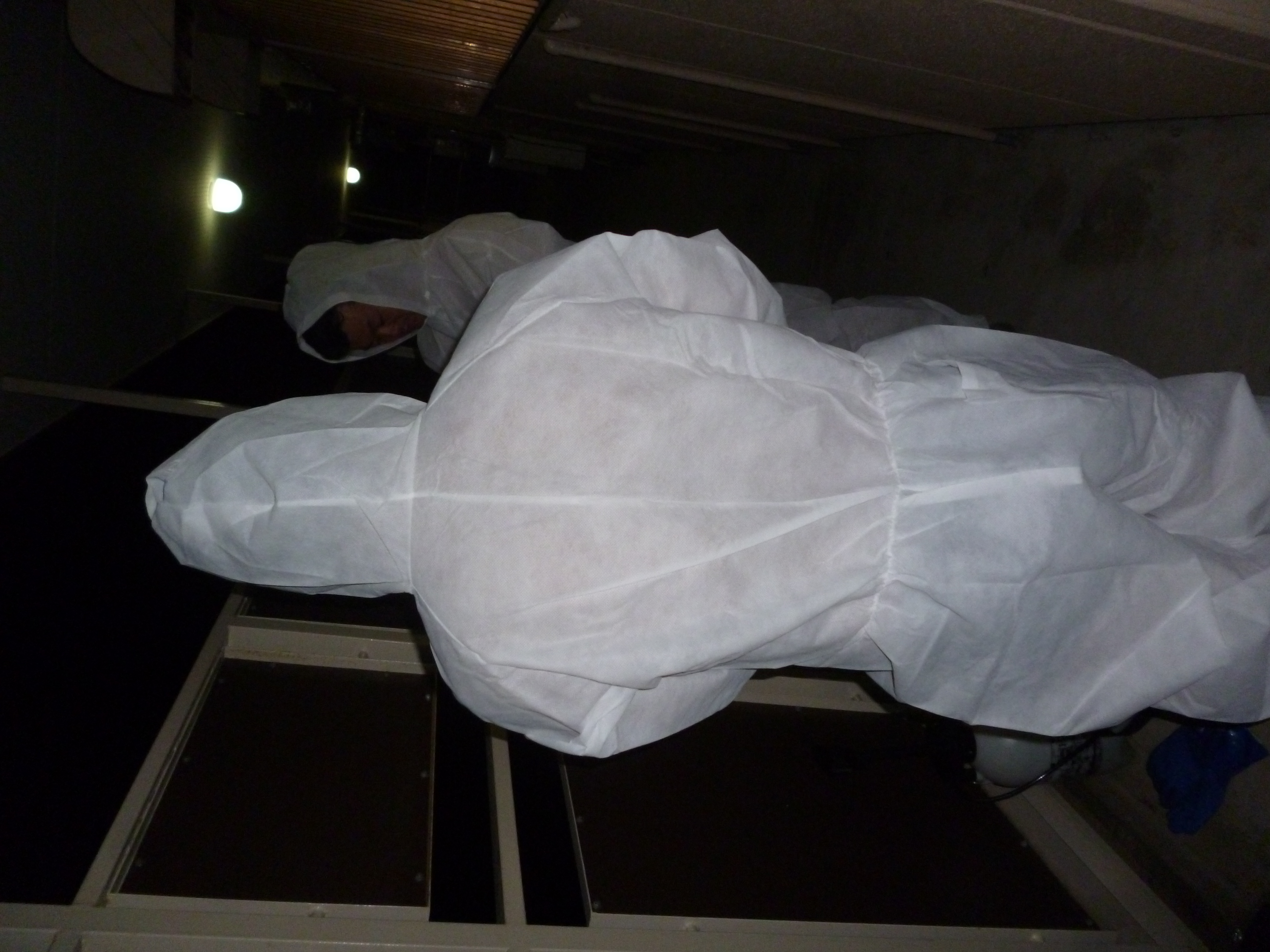 スタッフさんは防護服などで完全防衛した状態でRB酸水とオゾンでの消毒作業を開始されました。