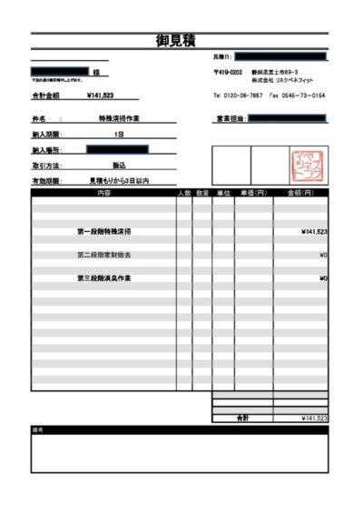 見積もり料金としては15~20万円ほどと言われましたが、家の間取りは5LDKの平屋と広く、汚物や異臭の除去は素人目線で見ても大変そうだと感じたため、むしろ安いのではないかと思います。